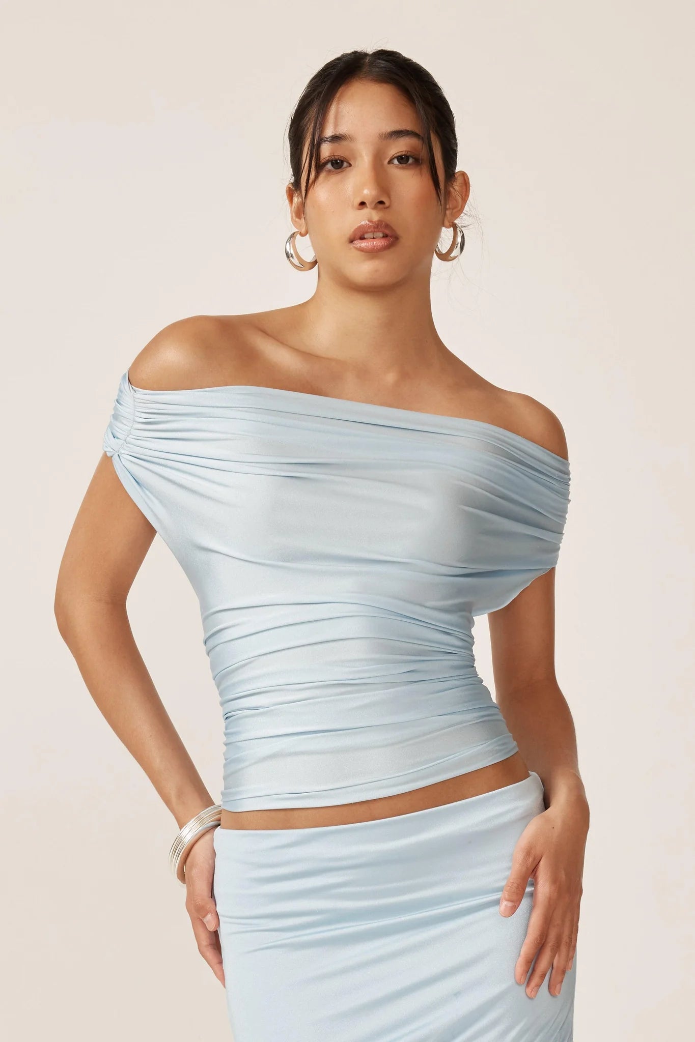 The Grace Top by Ance Gria is a striking off-the-shoulder statement piece crafted in a luxe shiny stretch lycra. Featuring a delicately ruched side detail designed to cinch the waist and flatter the silhouette, this top effortlessly balances elegance with a modern edge.