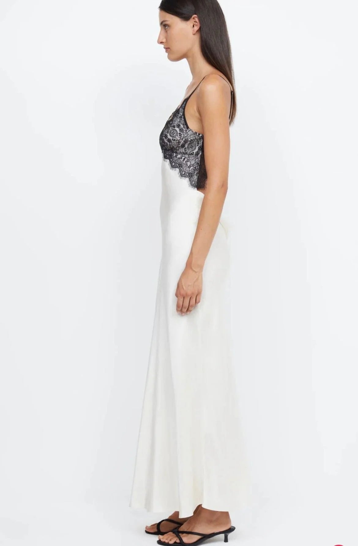 V NECK WITH UNDERBUST SEAM, COVERED WITH LACE DETAILING. THIN ADJUSTABLE ROULEAU STRAPS. DESIGNED TO BE FITTED AT BUST AND HIPS FALLING INTO A RELAXED FIT THROUGH THE SKIRT. MAXI DRESS IS ACCESSED THROUGH E-HOOK HARDWARE AT BACK.