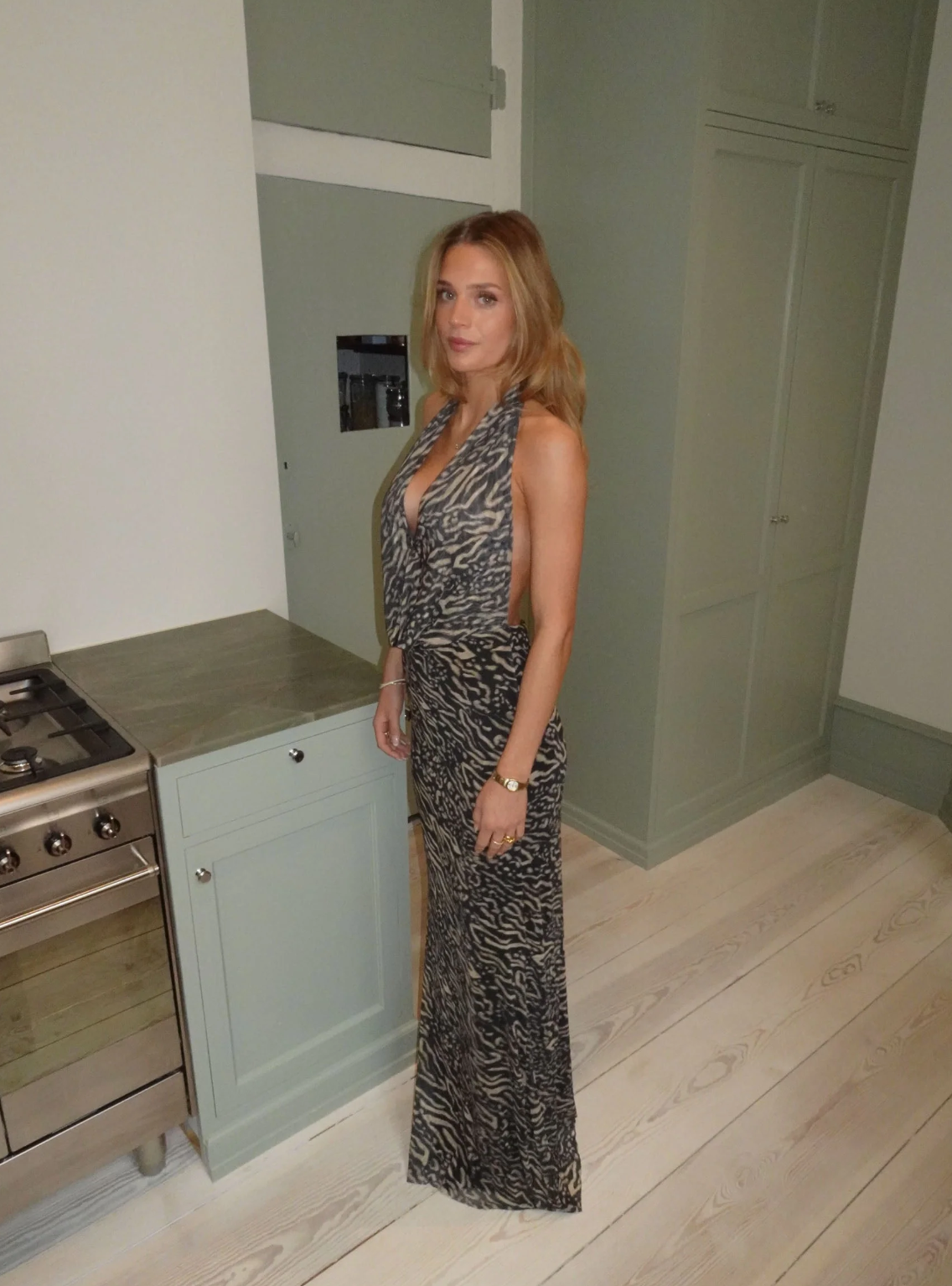 Our Columbine Maxi Dress in animal print is the ultimate party dress, perfect for the upcoming festive season. The dress features an open back and an elegant halter neck. With its maxi length, it provides a dramatic and sophisticated look, making it ideal for any celebratory event. The leopard print adds a wild and modern touch, making this dress incredibly eye-catching.