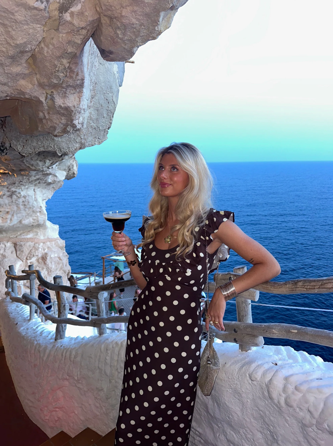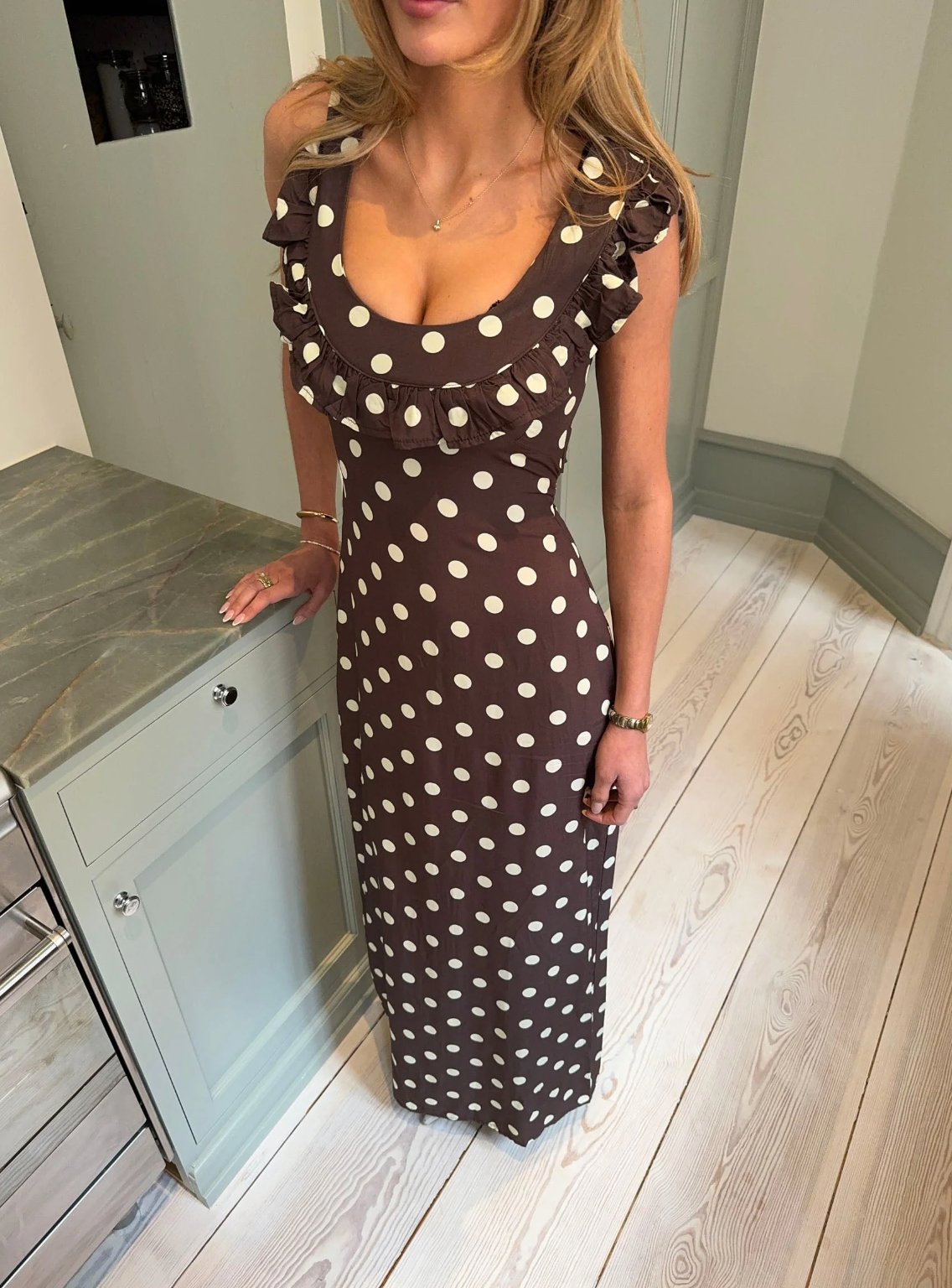 A feminine maxi dress with a timeless polka dot pattern. The design features a flattering fit with delicate ruching details at the shoulders and an elegant open back that adds a modern twist. The delicate tie straps at the sides highlight the waist, creating a beautiful silhouette.