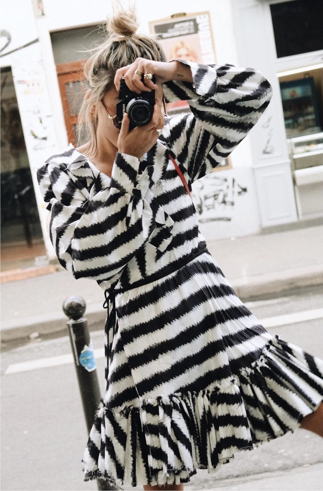 The Tablas Dress is a long sleeved, mini length style with fitted waist, accented frill detailing and V-neckline.