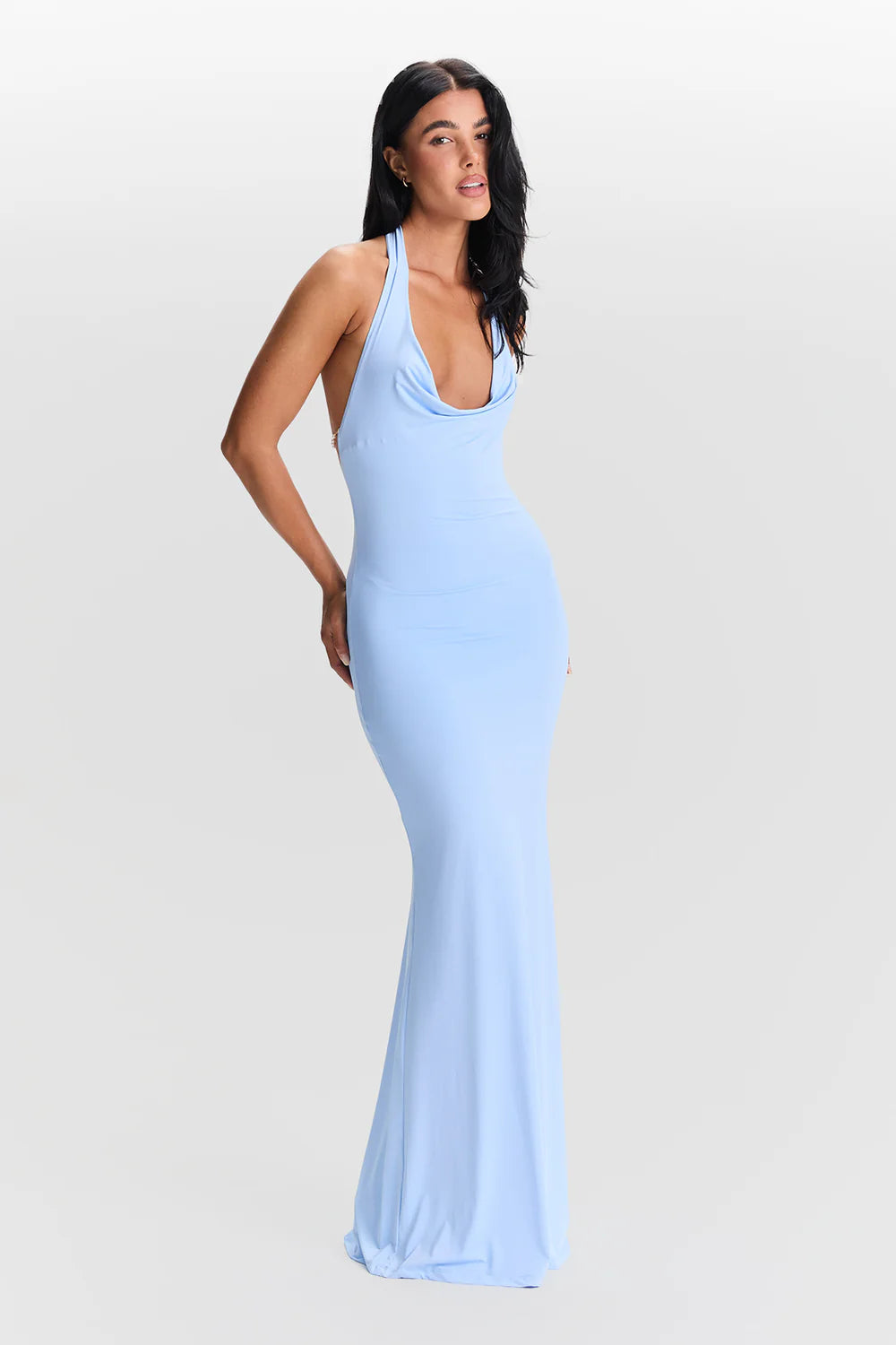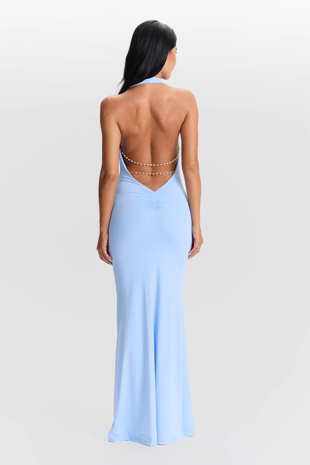 Make an unforgettable entrance with the Harper Maxi Dress by Sasha Therese – a head-turning design inspired by the bestselling Naomi Top. This elegant floor-length gown features a plunging cowl neckline and a seductive open back adorned with detachable pearl chains for a luxurious finish.