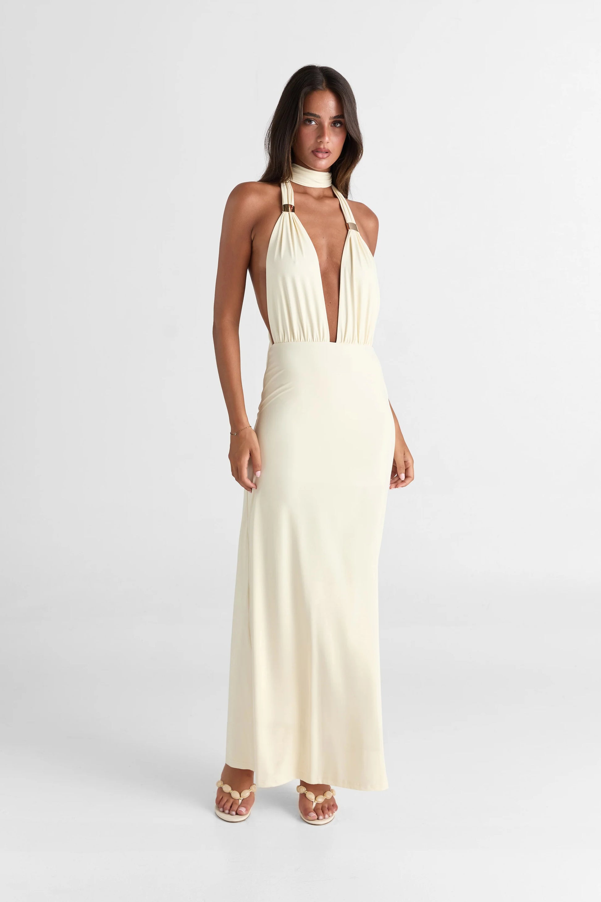 Introducing our Mira Maxi Dress. Featuring a plunging neckline with gathered bust panels, our Mira Maxi Dress is fully adjustable and can be styled multiple ways.Made from our signature buttery soft fabric with an open back, it is fully lined to give you the most flattering silhouette. The gold hardware details have been designed to move along the tie straps in order to adjust bust coverage and to compliment you in all the right places.